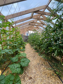 Notre auto-construction de serre en ossature bois section 145x45 accueille aujourd'hui de nombreux légumes : tomates, courgettes, concombres, courges, poivron, aubergines, laitues...
