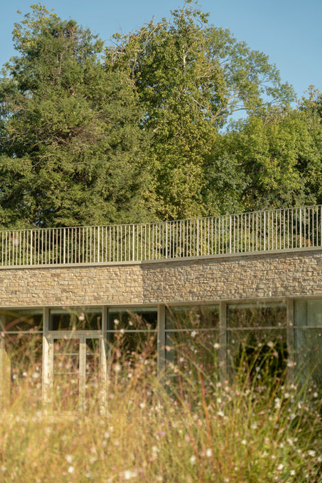 Nous avons choisi d’enterrer le projet de telle sorte que sa cinquième façade soit au même niveau que la pelouse existante, servant de belvédère sur la forêt. Ainsi, la vue splendide du parc depuis le château n’est pas arrêtée. L’unique façade du bâtiment est orientée vers le parc et est largement vitrée. Un parement pierre permet d’accentuer le coté monolithique et minéral du projet et contraste avec le végétal environnant.